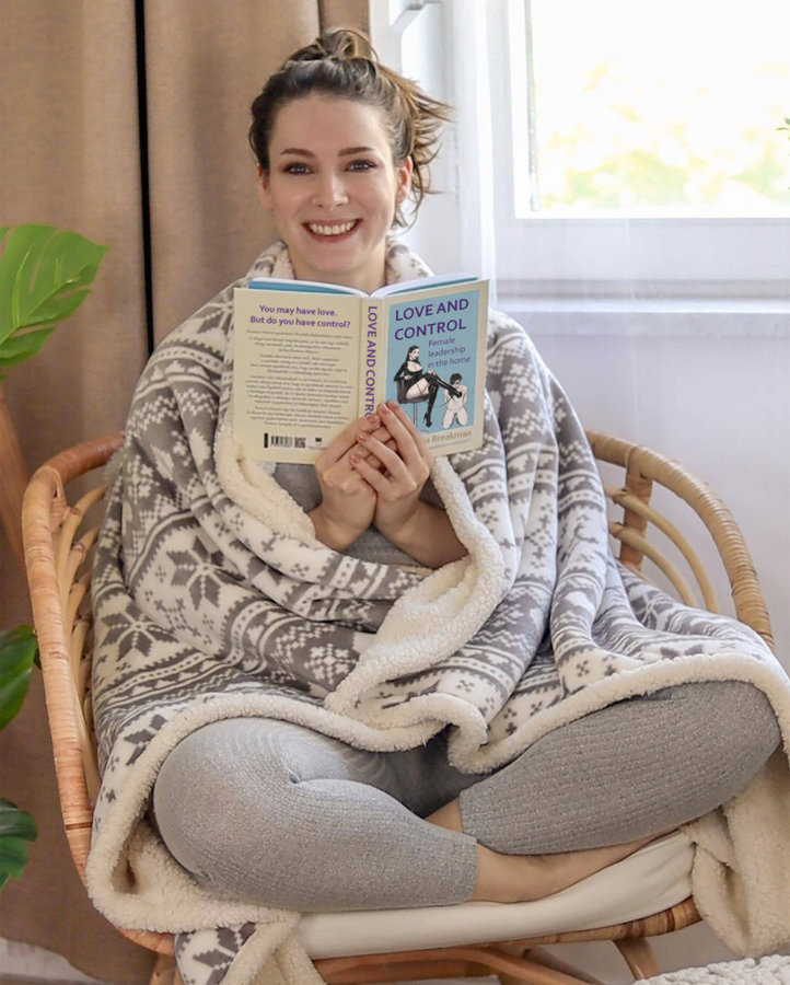 " C’est amusant que tu dises ça, car c’est précisément le genre de mythe sexiste que ce livre tente de corriger. Tu vois l’image d’un homme en laisse, nu à l’exception d’une ceinture de chasteté, embrassant la botte de sa femme, et tu trouves cela oppressif. Mais c’est parce que le patriarcat t’a conditionné à penser ainsi. L’autorité masculine peut être coercitive et désagréable pour celles qui la subissent mais l’autorité féminine est en réalité très bienveillante et bénéfique pour les hommes : apparemment, d’après ce livre, vous en profitez vraiment. Baiser la botte d’une Femme est une sincère marque de gratitude à son égard. Je veux dire qu’il faut parfois ainsi renforcer cette marque gratitude, car les hommes ont du mal à le faire, mais cela ne la rend pas moins authentique. Ceci étant dit, on n’est pas obligé de commencer par là. Pourquoi ne pas essayer la chasteté et quelques fessées pour commencer à corriger certaines de tes attitudes sexistes ? De toute façon, je n’ai même pas encore de bottes comme ça, enfin pas encore. "